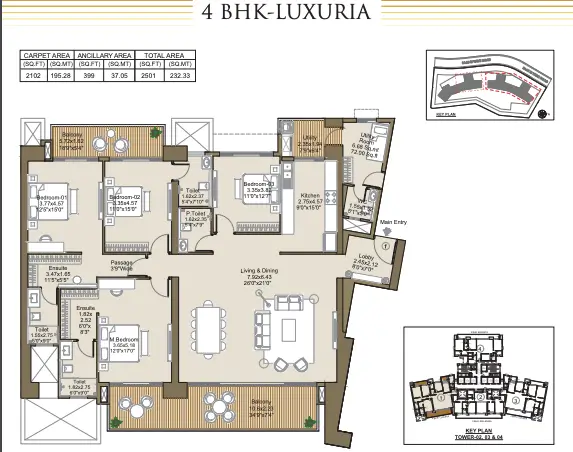 The sizes range from about 2,850 sq. ft. for 3 BHK apartments to over 5,700 sq. ft. for premium 5 BHK units. Each apartment is crafted with superior materials like vitrified tiles, granite kitchen counters, and modern sanitary fittings to ensure lasting quality and style.